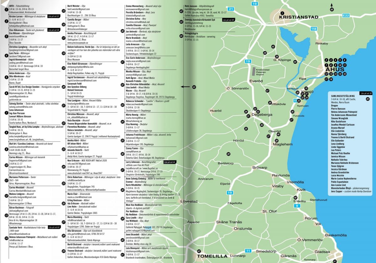 I ”Vi syns i Åhus” publiceras också en karta över utställarna i Åhustrakten. En utmärkt guide för alla som åker på konstrunda i Påsk.