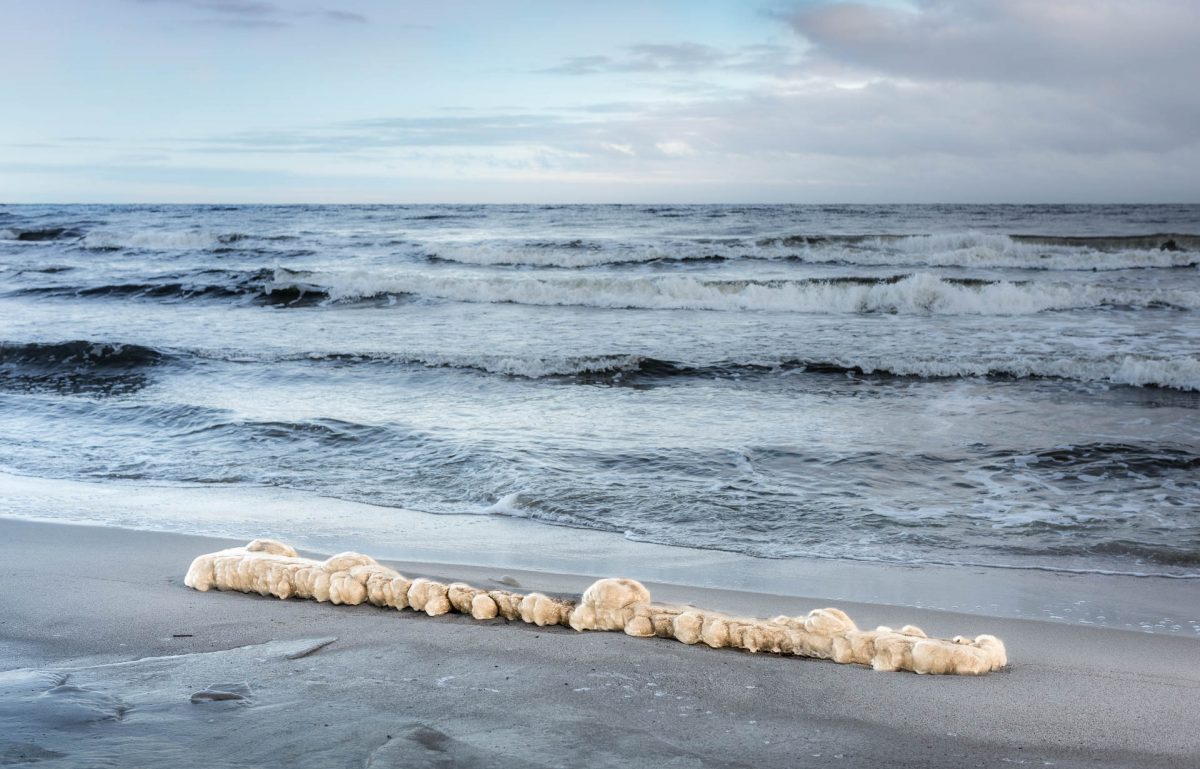 Ilandfluten istäckt stock på Hanöbuktens strand. |
