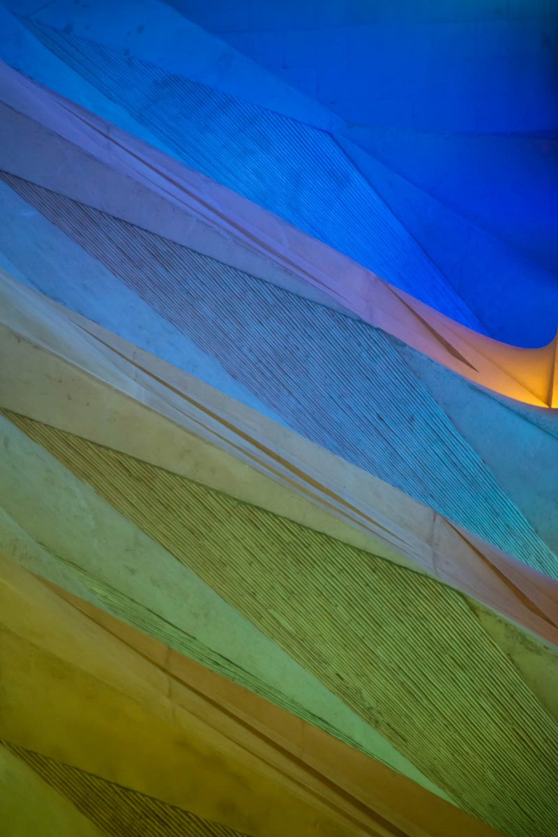 Tak i Sagrada Familia katedralen i Barcelona belyst med färgade lampor.